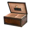 Denne humidor i serien Humidor Supreme er designet til cigarentusiasten med en større samling. Ifølge produktbeskrivelsen hos jeres webshop er den belagt med vintage brun læder med håndhamrede nitter, og den har både hygrometer og humidifier inkluderet.